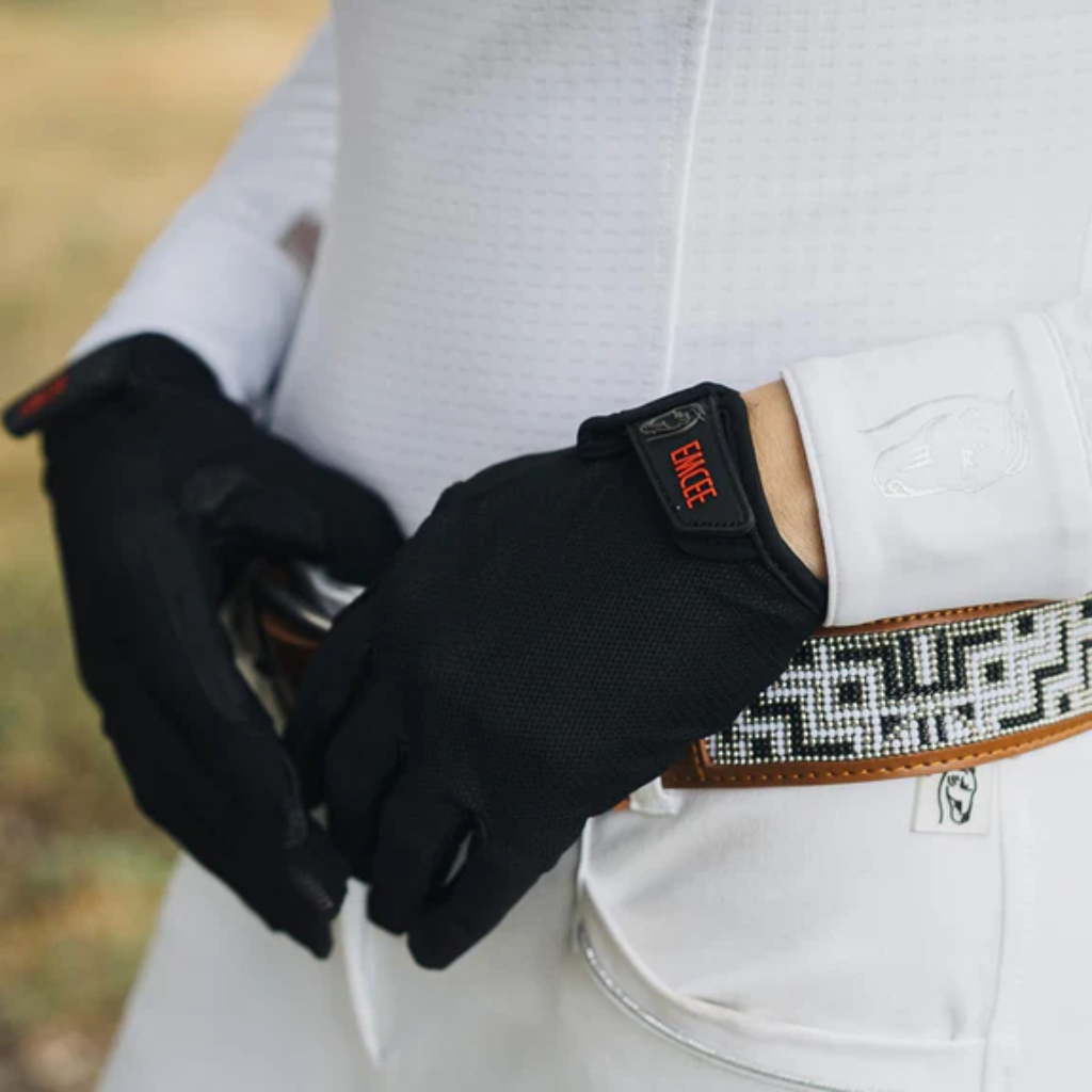 Emcee Apparel's Gloves have a soft leather palm, ensuring close contact with the reins while being tough enough to withstand the pressure of grip. The back side of the glove is constructed from a light mesh fabric to allow breathability and full range of movement. The glove does up with a velcro tag around the wrist.